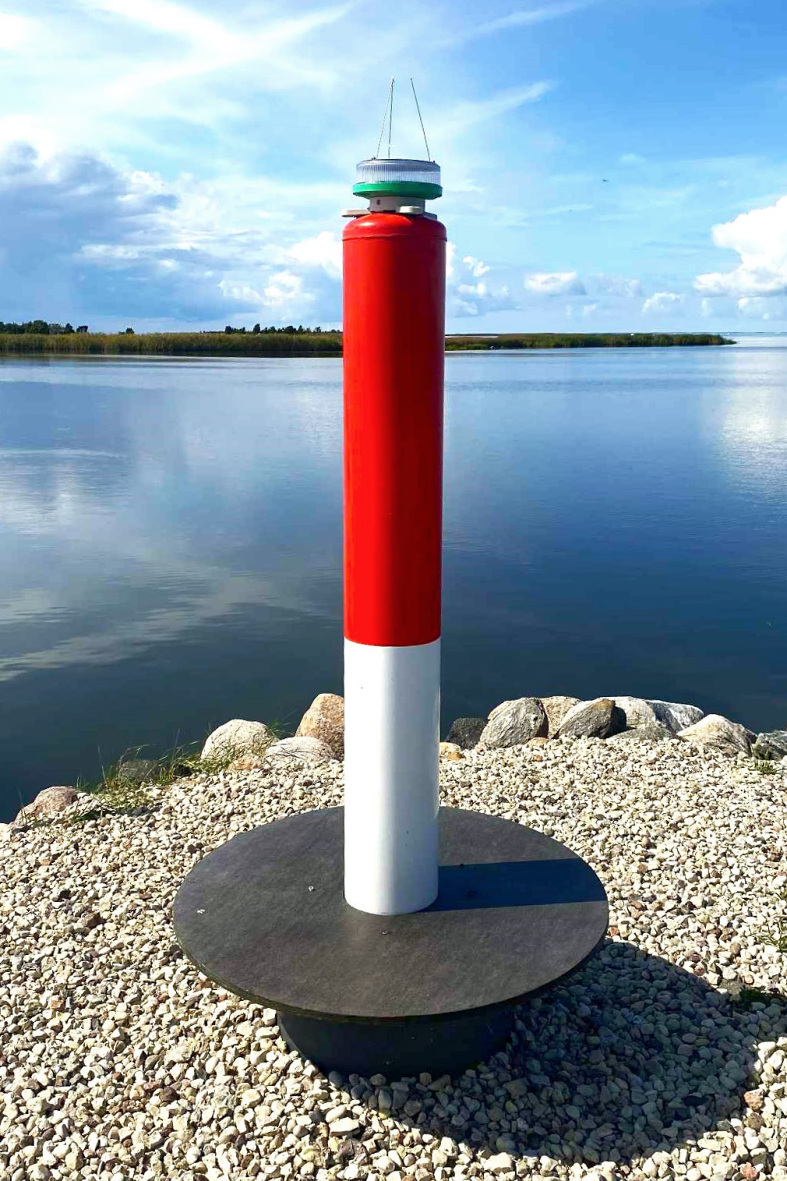 Valge/punane koonus (H 1500 mm, diam 200 mm), mille otsas on plinkiv navigatsioonituli Sabik M660G-2B.