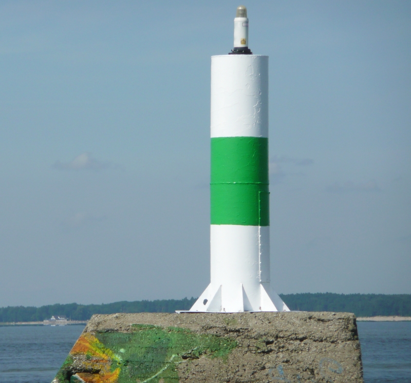 Rohelise rõhttriibuga valge metallsammas betoonalusel