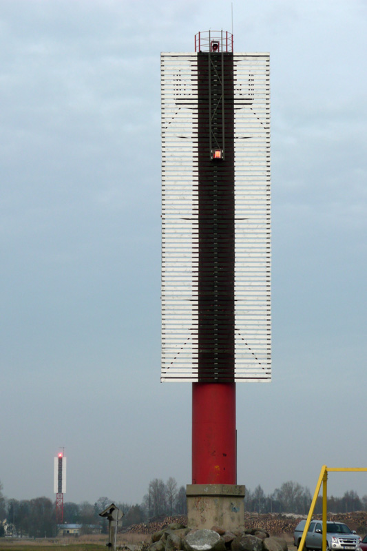 Musta püsttriibuga valge täisnurkne tahvel punasel metalltornil