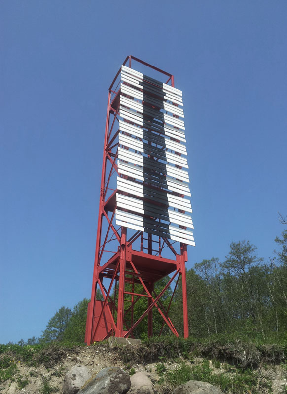 Musta püsttriibuga valge täisnurkne tahvel metallsõrestiktornil