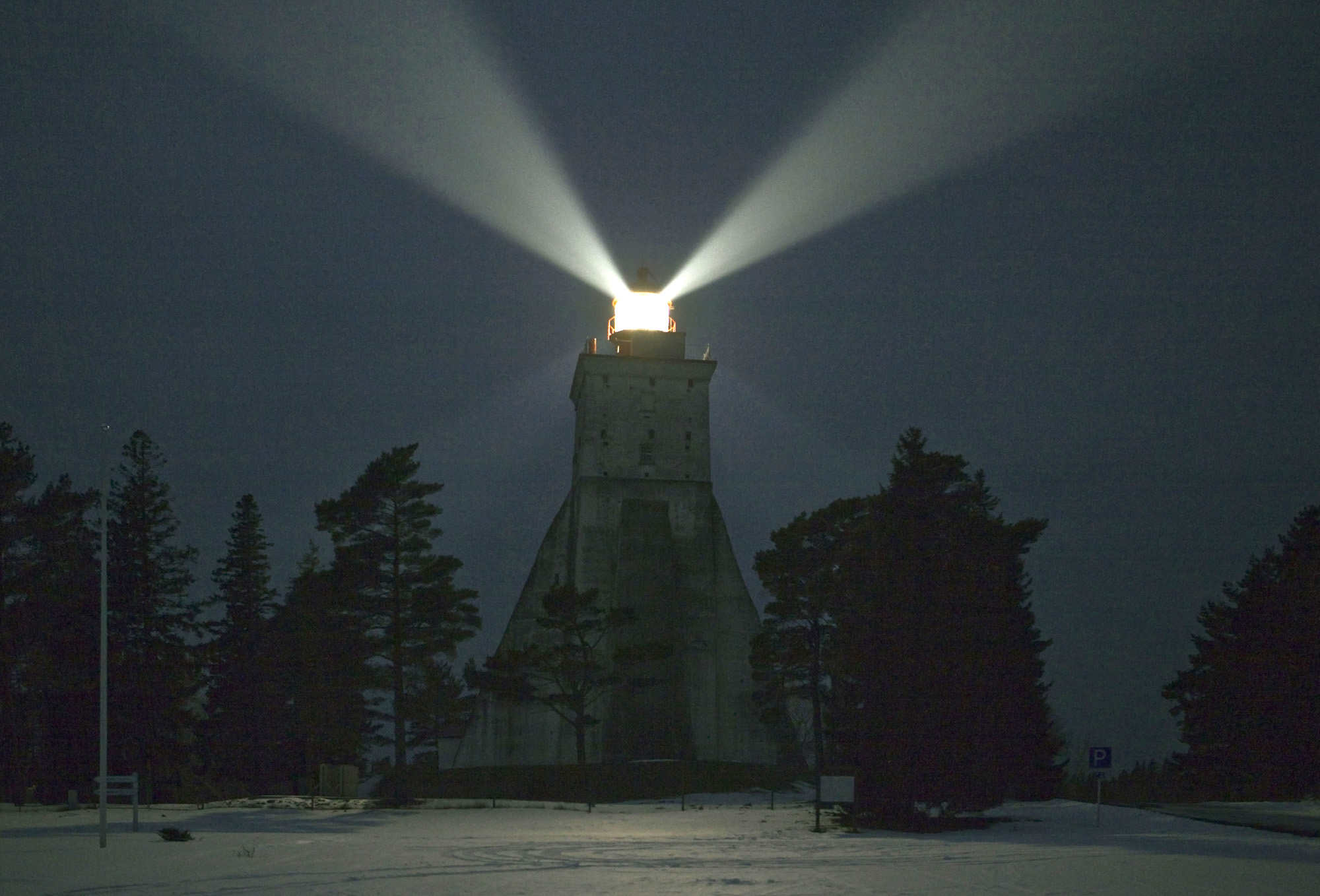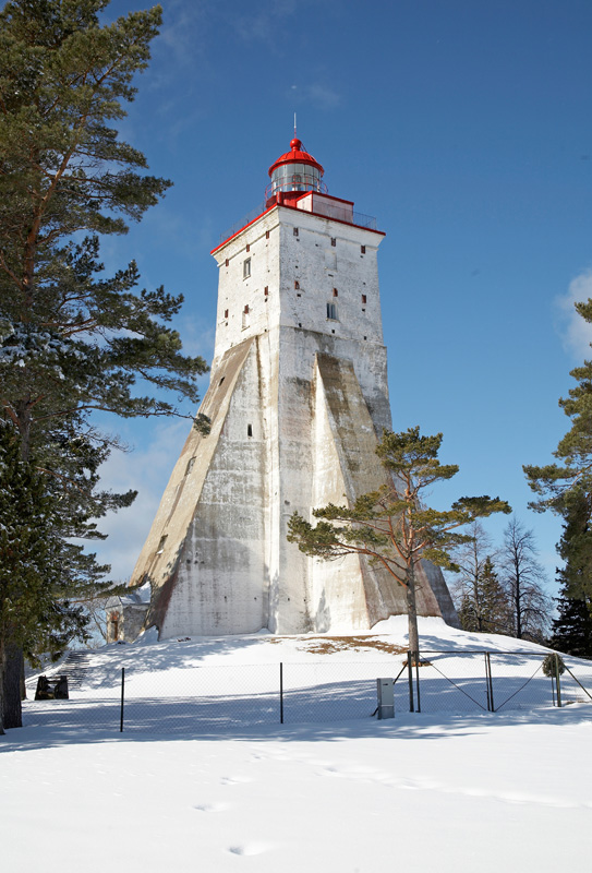 Rõdu ja punase laternaruumiga valge neljatahuline tugipiilaritega kivitorn