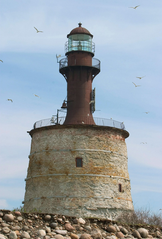 Laternaruumi ja rõduga punane metalltorn kõrgel kivialusel