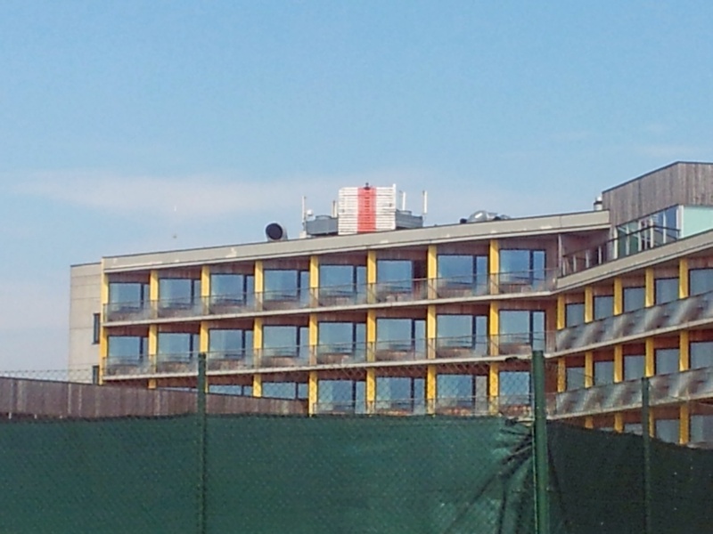 Punase püsttriibuga valge täisnurkne tahvel hoone katusel