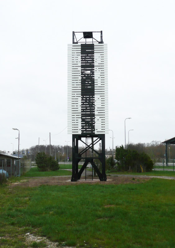 Musta püsttriibuga valge täisnurkne tahvel metallsõrestiktornil