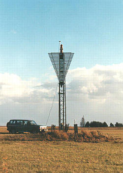 Musta püsttriibuga valge kolmnurk, tipuga alla, metallsõrestikmasti tipus