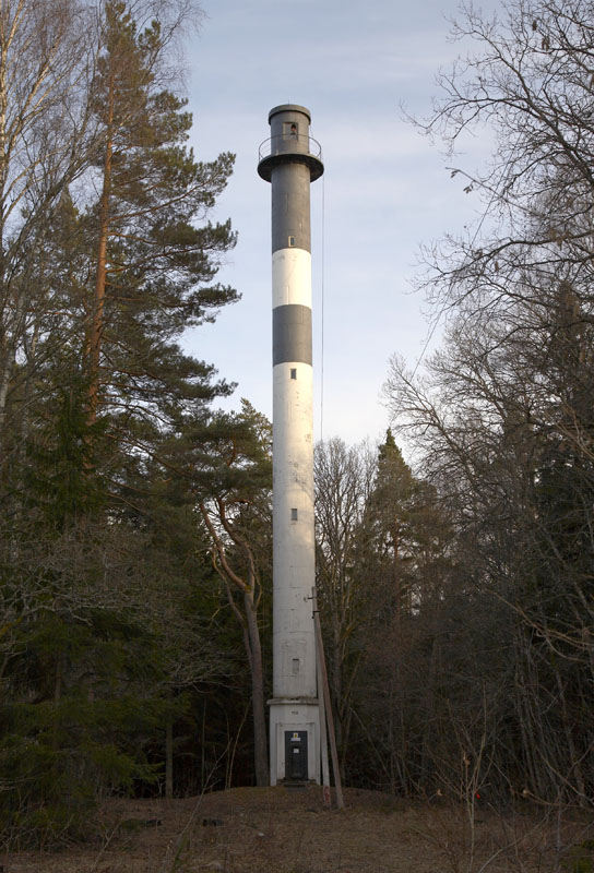 Rõdu ja musta laternaruumiga musta-valgetriibuline betoontorn
