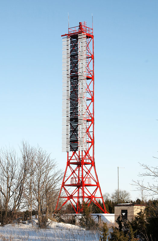Musta püsttriibuga valge täisnurkne tahvel metallsõrestiktornil