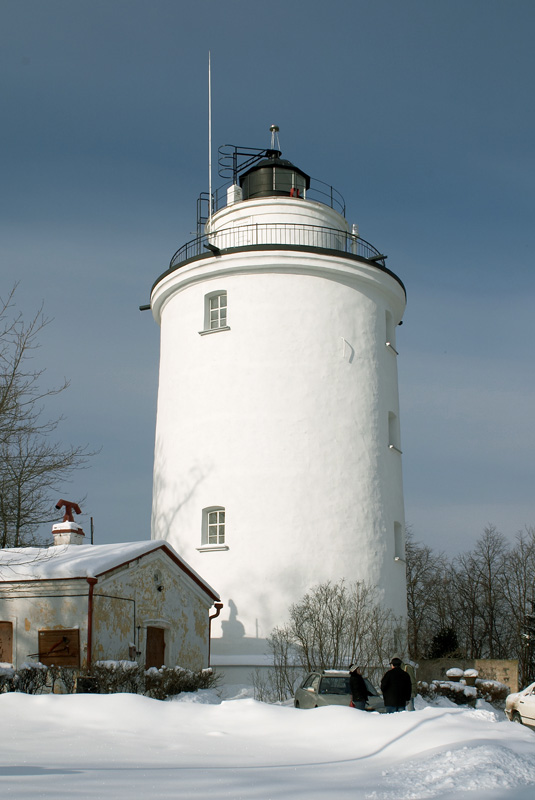 Rõdu ja musta laternaruumiga valge silindriline kivitorn