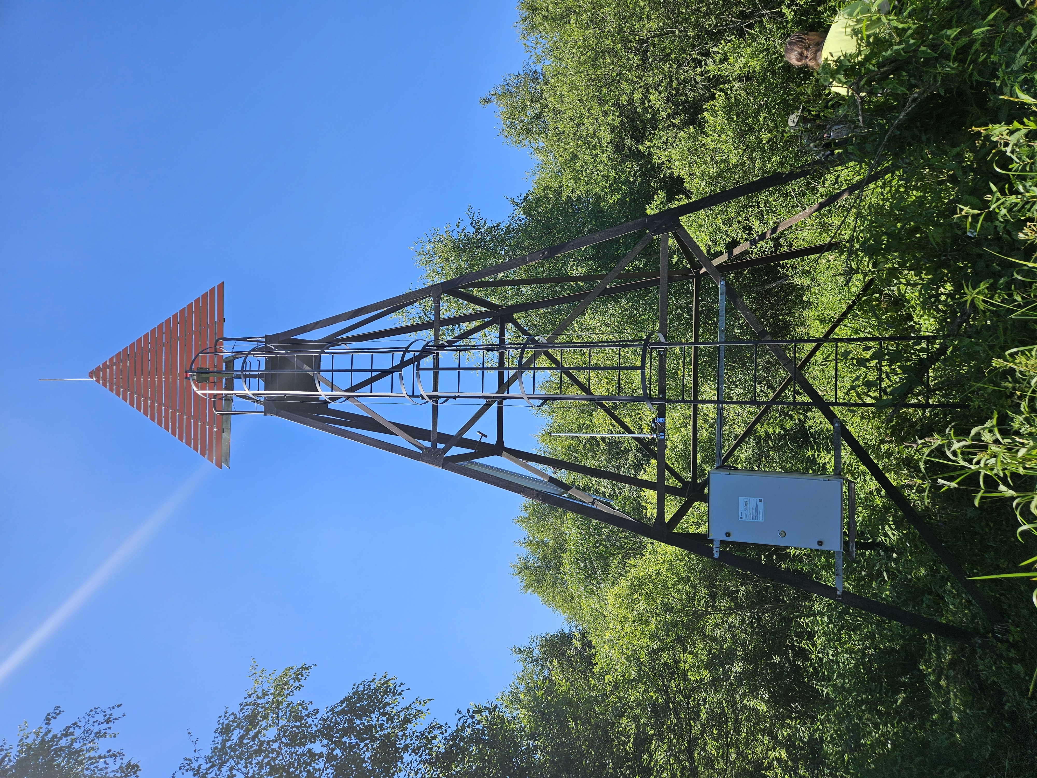 Püramiidjas must metallsõrestiktorn, tipus üles suunatud oranž kolmnurk.