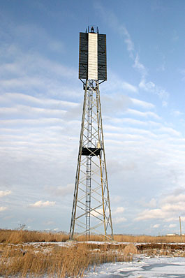 Valge püsttriibuga must täisnurkne tahvel metallsõrestiktorni tipus.